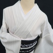 こちらのお着物は、ライトグレイッシュトーンの彩色で夏紬の清々しさにフォーカスしたシンプルな縦縞模様を込めています。どこまでも控えめな主張で、嫌みのない“さりげないセンス”がとても新鮮に映るお召し物です。