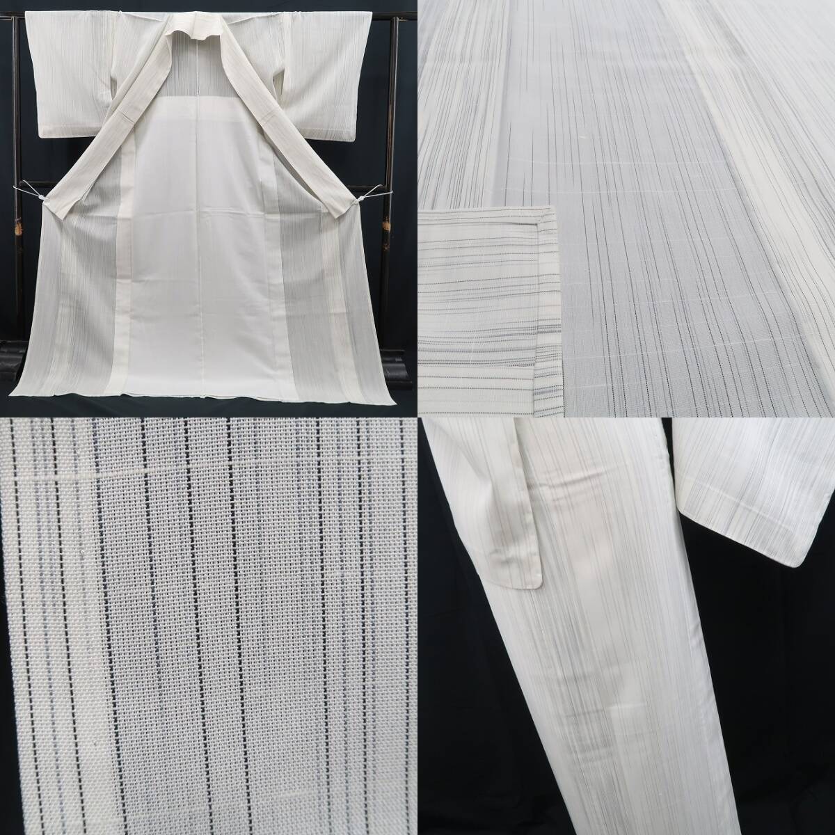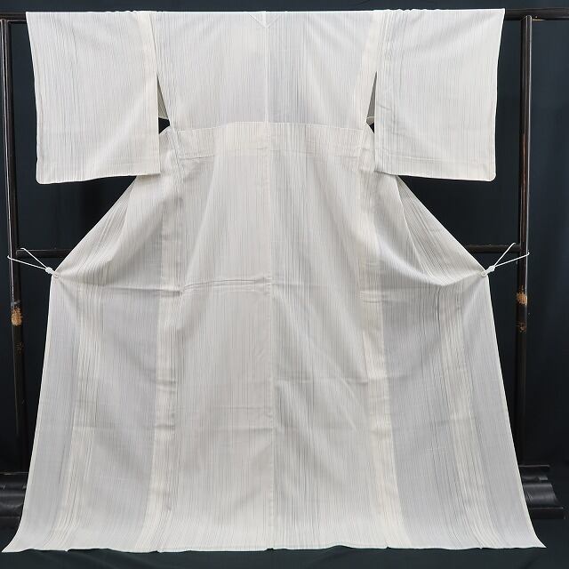 優しい生成り色の地に紡ぎ出された味わい豊かな縦縞模様、紗の透明感にアシンメトリーなデザインラインが創り出すその表情は“涼を趣く夏着物の魅力”そのもの、自然味溢れる素材感とセンスの中にもこだわりが感じられるひと品、季節の装いに、お奨めです。