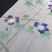 クレマチスは、“単独で描かれている場合は初夏の柄”として、“他の季節の花と一緒に描かれている場合は通年の柄”とされていますが、もともと一季咲きと四季咲きがあり季節感を強く感じさせないため、単独でも通年お召いただける花柄です。