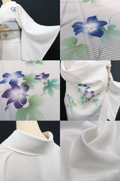 こちらのお着物は、ライトグレイッシュトーンの色地に夏モダンを意識した季節の花“クレマチス”を込めております。華やかなるも上品に…夏着物の透明感とともに嫌みのないさりげないセンスがとても印象的に際立つお召し物です。