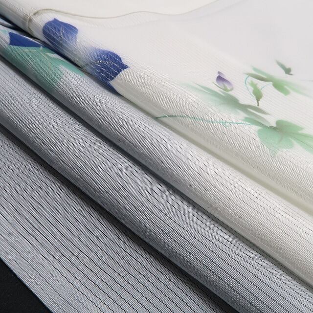 昨今、夏に和装をされる方が少なくなり希少なものとなりつつある絽のお着物は、二本の経糸を捩りながら緯糸を織り込んだもじり織で、盛夏のお召し物として涼しげでさらりとした生地質が魅力、着る方にもまた見る方にも清らかな風を感じるような涼しさを届けてくれます。