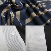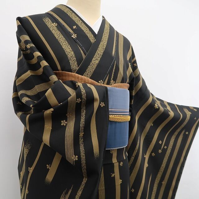 こちらは、黒地に菜種油色の縦縞が美しく走る、紗紬の本場大島紬。証紙付のお品でございます。