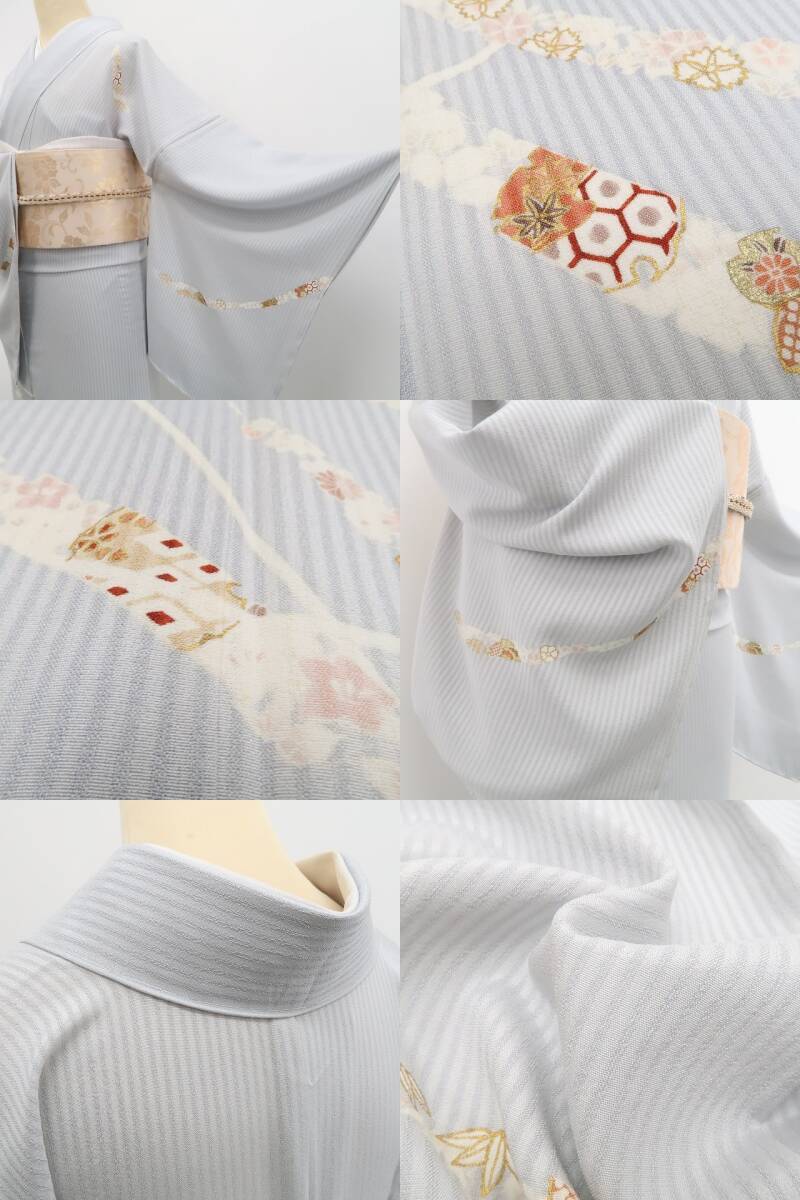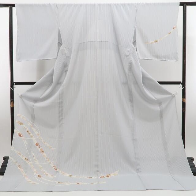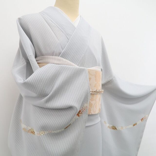 薄いグレーの彩色に広がる楚々とした風、巧みな構図で流れるデザイン熨斗の色模様、古の絵柄が醸し出すこの上ないお洒落感は格別!それは“美しい着物に袖を通す至福のひと時”…落ち着きを魅せる女性らしさに溢れ出す和の風情を存分にお感じいただけることでしょう。