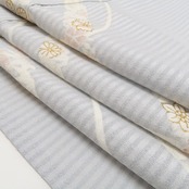 熨斗(のし)模様は、吉祥模様のひとつで、もともとは贈り物に添える熨斗鮑を模様化したもの。細長い帯状の熨斗を数本束になって表したものは「束熨斗(たばねのし)/熨斗目(のしめ)」と呼ばれています。「多くの人から祝福を受けていることと、その幸せを周囲にも分け合う」という意味があり、その他にも人と人との絆や繋がりを表し、その長さから長寿の象徴でもあるとてもおめでたい文様です。