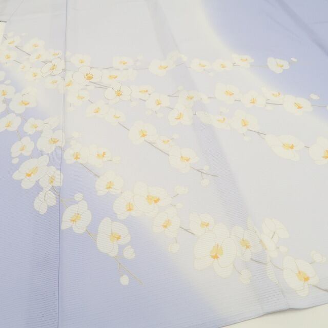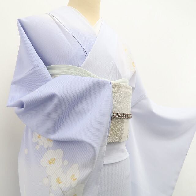 丸みを帯びた青藤色と藤鼠色の涼彩に巧みな構図で咲き誇る胡蝶蘭の花、それは絽の豊かな透明感に夏花の生き生きとした表情が醸し出すこの上ないモダンな色艶、シンプルなテーマながら内に秘めた着物の華が表現されたひと品、美しくも飾り過ぎず…夏のシルエットを演出しエレガントな魅力と深みを備えた大人の着姿を貴女へ。