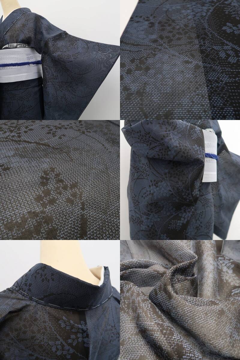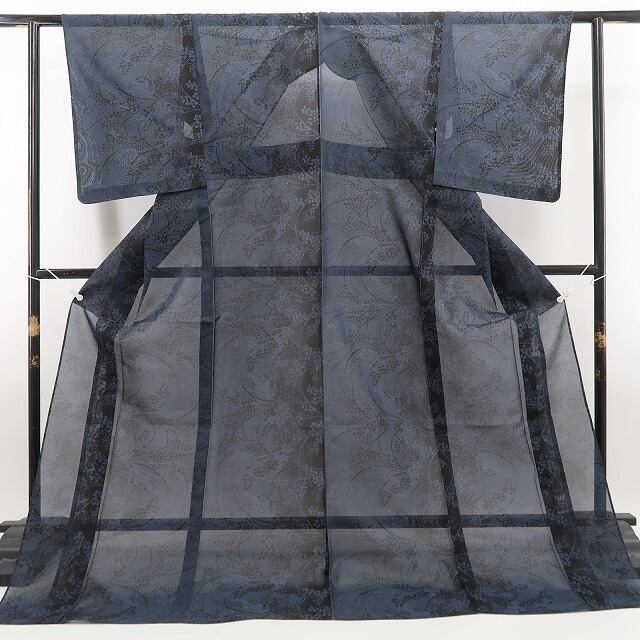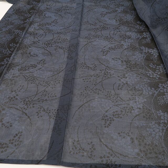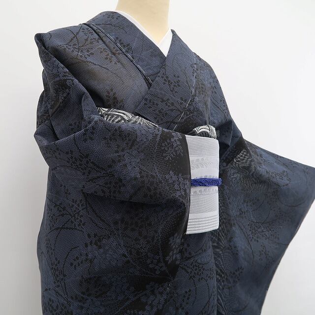 大島独特のシャリ感が活きる涼やかな紺鼠色の色使い、紗の透明感に艶めいて浮かび上がる夏花のシルエット、紗紬の涼感に溢れ出す本場紬の見事な風合い、どれを取ってもその上質さは本場大島紬ならでは、素敵です。