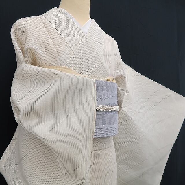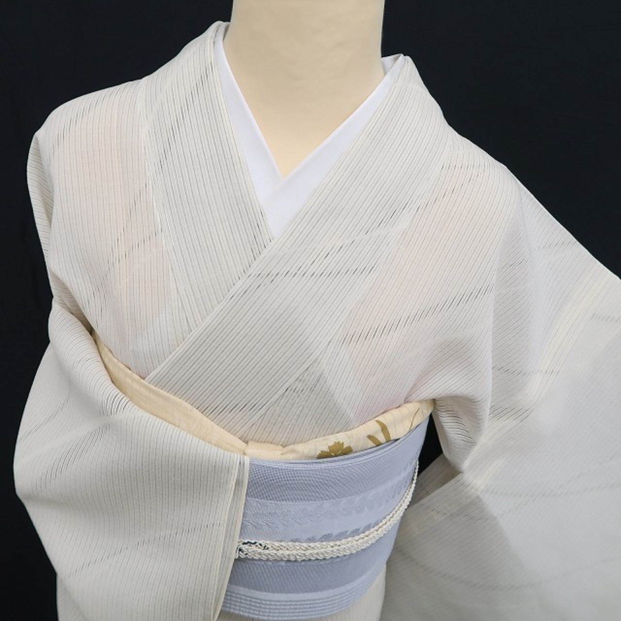楚々とした象牙色の地に描き込まれた風を趣くラインデザイン、流線状に涼を挿すその表情は夏着物の魅力そのもの、正に受け継がれる伝統工芸の技が創り出す明石上布の清々しさ、さらりとした極上の肌触りをどうぞ心ゆくまでお楽しみください。