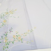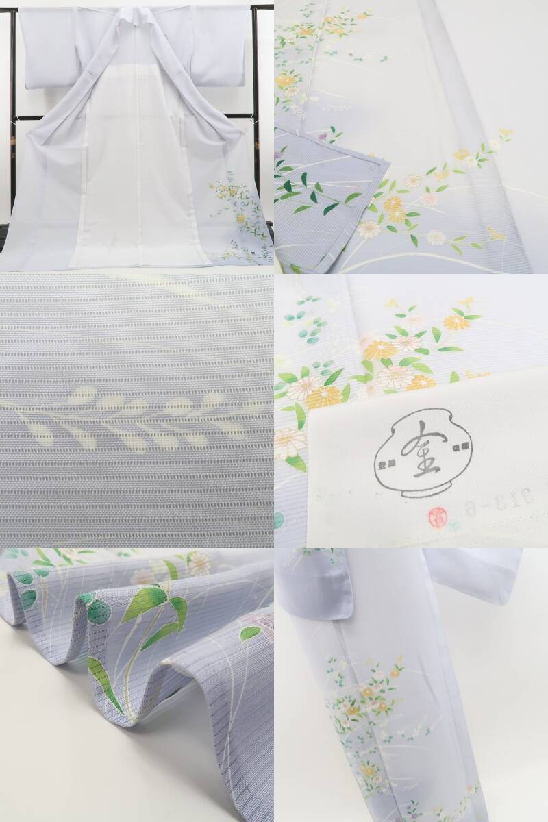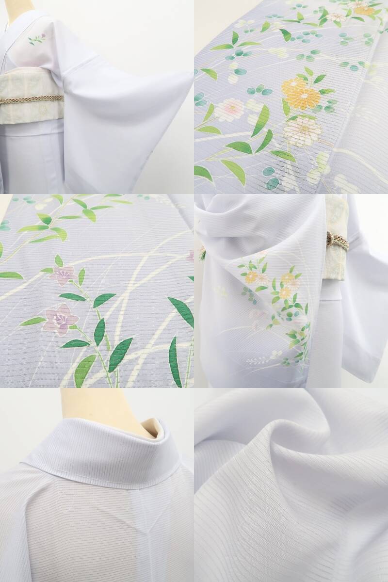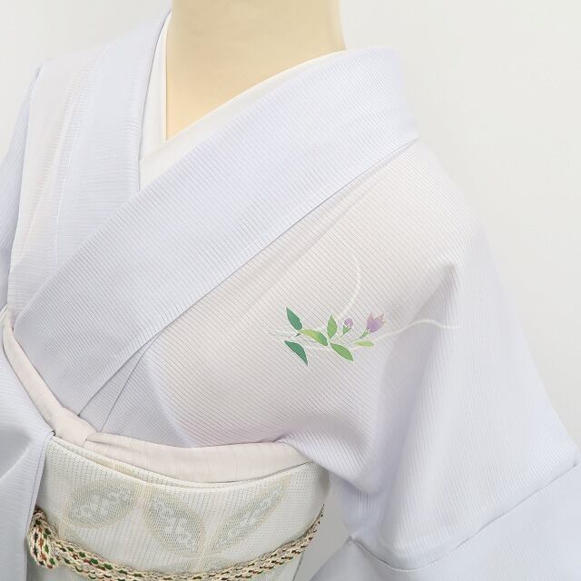 淡藤色の優彩が趣く楚々とした表情、絽の透明感に柔らかな艶を放つ可憐な野花のデザインモチーフ、それは柔らかなフォルムに醸し出される慎ましき夏の華やぎ、着物の奥行を楽しむ日本人の美意識が活きたひと品、正に夏着物ならではの魅力が艶色豊かにに表現されています。