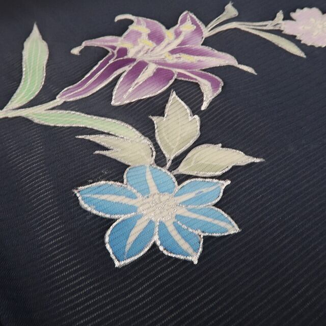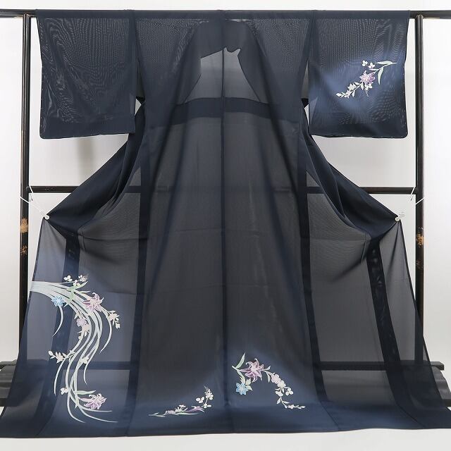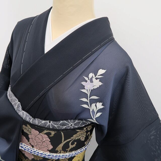 シックな黒の色地を抜ける涼やかな風、絽の豊かな透明感に添えられた可憐な百合のデザインモチーフ、滑らかな正絹の地に流線状の夏花が醸し出すこの上ないモダンな色艶、奥深い夏の装いがお楽しみいただけるお洒落派着物です。