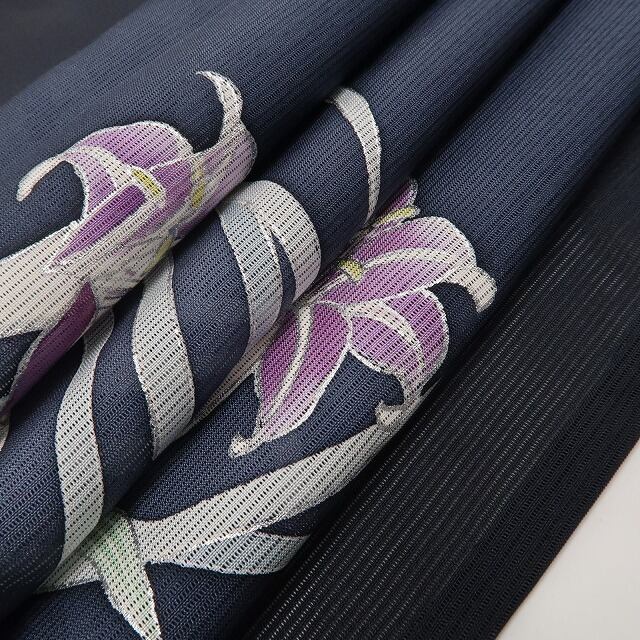 昨今、夏に和装をされる方が少なくなり希少なものとなりつつある絽のお着物は、二本の経糸を捩りながら緯糸を織り込んだもじり織で、盛夏のお召し物としてさらりとした生地質が魅力、着る方にもまた見る方にも清らかな風を感じるような涼しさを届けてくれます。