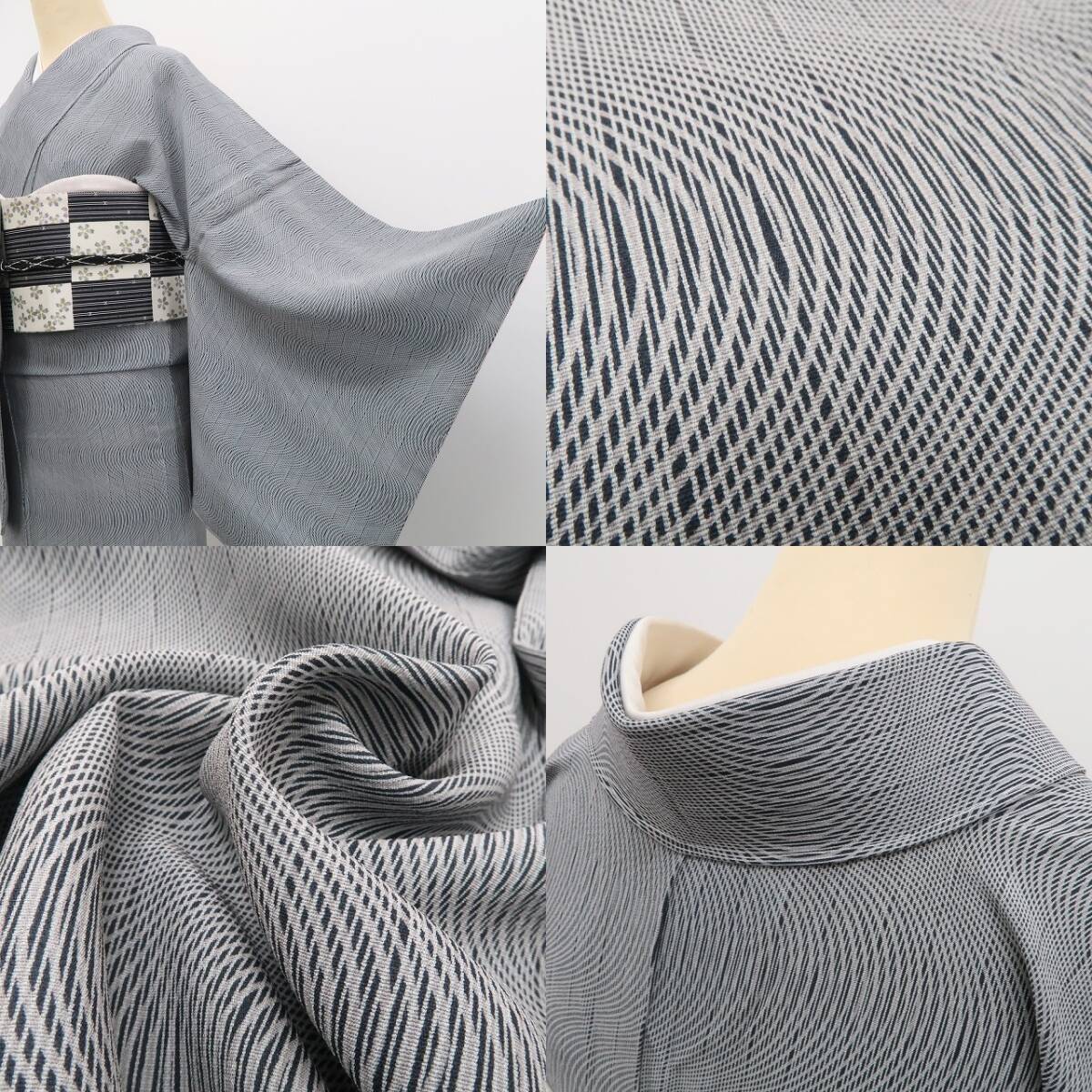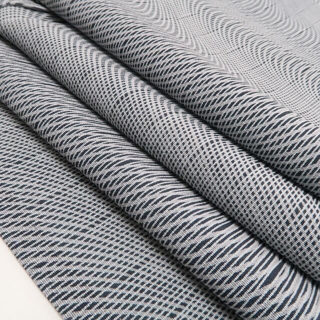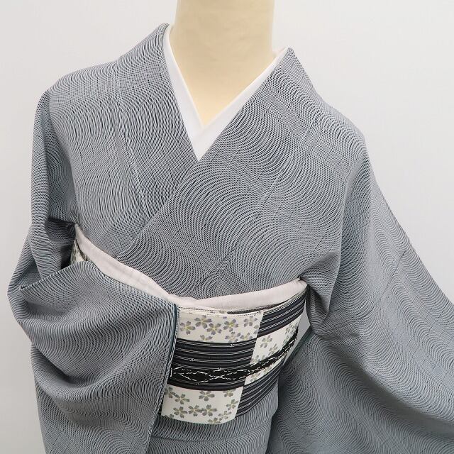 グレー地の落ち着いた色合いが、粋な装いの中に静かな美を添えてくれる一枚。鶯張縞と伊予簾の曲線が重なる柄行きは、控えめでありながらも風情にあふれ、女性らしさと凛とした佇まいを演出します。