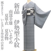 こちらは、伊勢型小紋の巨匠・南部幸雄氏が彫り上げた型紙を用い、染師・野村秀夫氏の手により染め上げられた逸品「いよぞめ」。夏の軽やかな空気を映し出す、正絹の夏単衣着物でございます。