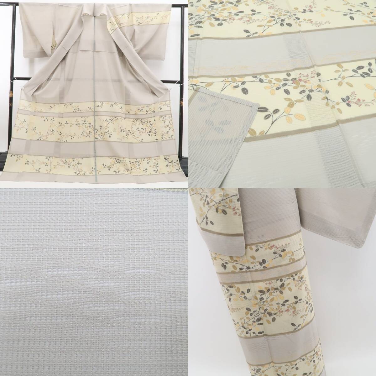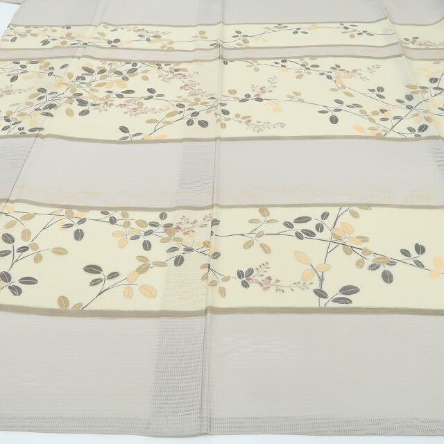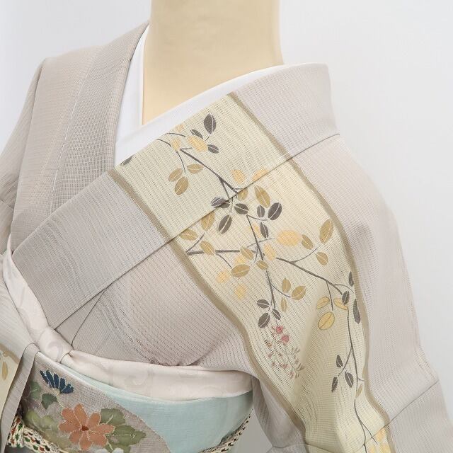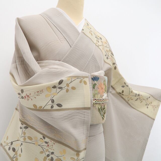 灰白色と砥粉色の彩色が放つこの上ない柔らかな艶、横段状の色分けに季節を標す可憐な萩のシルエット、それは紗の透明感に描き込まれた夏着物の粋な奥行、意匠に醸し出されるえも言われぬお洒落感は格別!落ち着きの表情に溢れ出す和の風情を存分にお感じいただけることでしょう。