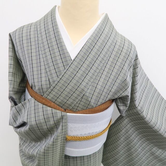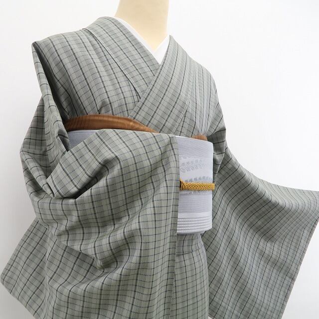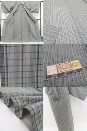 やさしい利休鼠色(りきゅうねずいろ)に細やかなチェック模様が映える、本場大島紬。