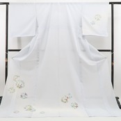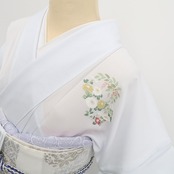 月白色の優彩が創り出す柔らかな艶、彩りに淡く色挿す花丸紋のデザインモチーフ、それは絽の透明感に映し出された誰にでもある記憶の残像、“貴女が証す花の真実”、巧みな意匠に醸し出されるこの上ないお洒落感は必見の価値あり!