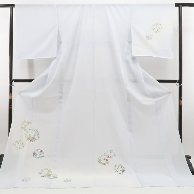 こちらのお着物は、柔らかなトーンの彩色で染めの美しさにフォーカスしたデザイン性の高い花寄せの丸紋を込めております。優彩に醸し出される慎ましき夏の華やぎ、着物の奥行を楽しむ日本人の美意識が活きたひと品、正に夏着物ならではの魅力が艶色豊かにに表現されています。