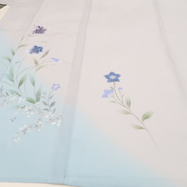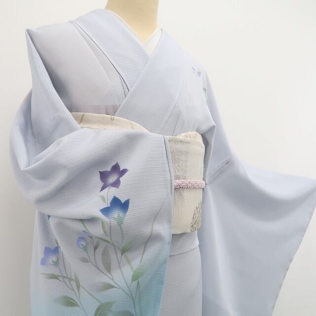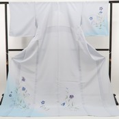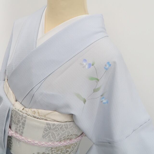 灰青色と浅縹色の濃淡が趣く柔らかな艶、絽の透明感に慎ましく色を挿す可憐な百合や桔梗のデザインモチーフ、丸みのフォルムに醸し出される「楚々とした夏の華やぎ」は必見の価値あり!創作着物の奥行を楽しむ日本人の美意識が活きたひと品、正に夏着物ならではの魅力が趣豊かにに表現されています。