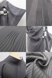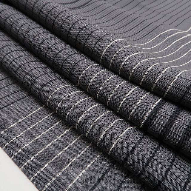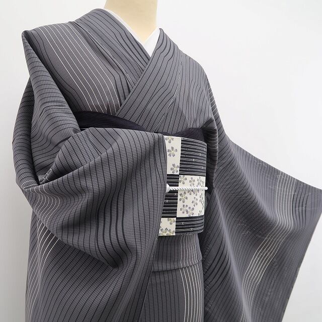 藍墨茶色の彩色に広がるこの上ない大人びた艶、絽の透明感に不統一な濃淡を描く馴染みの縦縞、それはアシンメトリーな構図に引かれた創作小紋の粋な奥行、洗練されたデザインセンスでエレガントに個性の美を演出するひと品、和の日常からお出掛けまで…様々なシーンで貴女の装いの満足度を高めてくれることでしょう。
