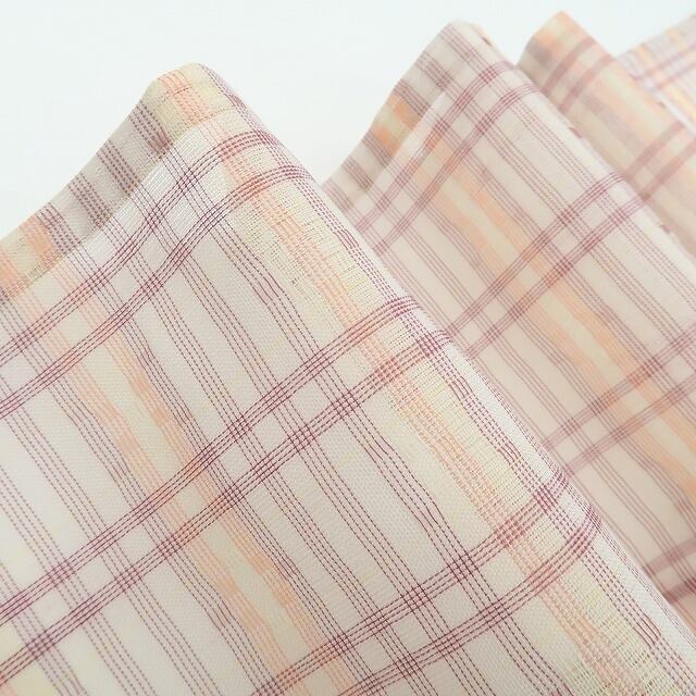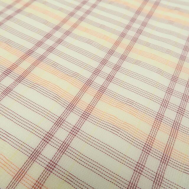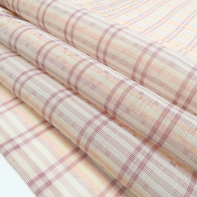 丸みある灰桜色を基調に多彩な色味で描き込まれた洗練モダンなチェック柄、それは紬地に花織独特の四角模様が創り出す心地よい風、意匠に醸し出されるこの上ない爽快感は格別!どれをとっても溢れ出す清々しさは花織紬ならでは、季節の装いにお奨めです。
