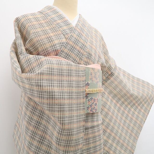 新品 紗 チェック柄 お仕立て上がり品 夏着物“絣の詩…遥かに聞こえる南の風と波の音”正絹 仕付け糸付 花織紬6029