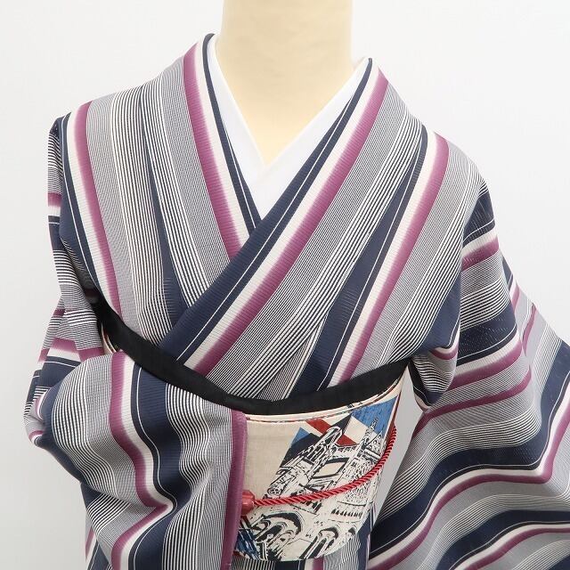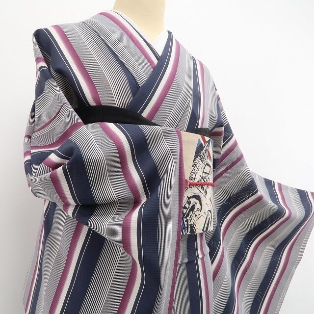 こちらのお着物は、正絹の滑らかな艶感に加えて従来ある縦縞のパターンを古典モダンにアレンジしています。創作物ならではの視覚を捉えるデザイン力!弊社にて反物より丁寧に仕立てたお品でございます。