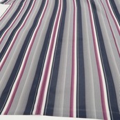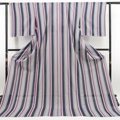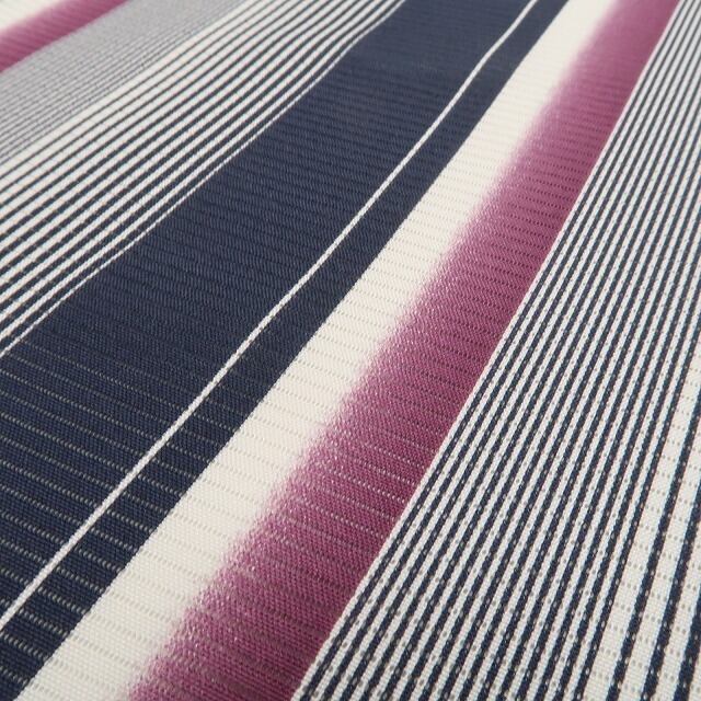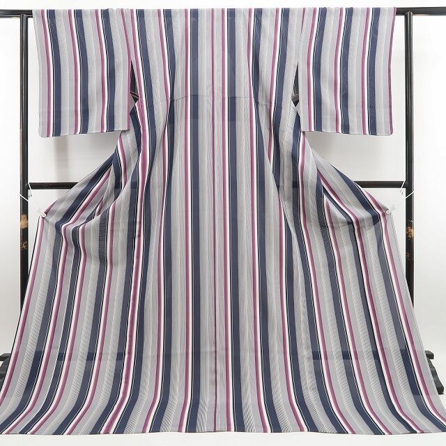 白・藍鉄色・赤紫色のコントラストで濃淡を描く味わい豊かな縦縞模様、絽の透明感に醸し出されるその表情は“懐かしくもあり、新しくもあり”、それはシンメトリーな構図に引かれた創作小紋の粋な奥行、洗練されたデザインセンスでエレガントに個性の美を演出するひと品、和の日常からお出掛けまで…様々なシーンで貴女の装いの満足度を高めてくれることでしょう。
