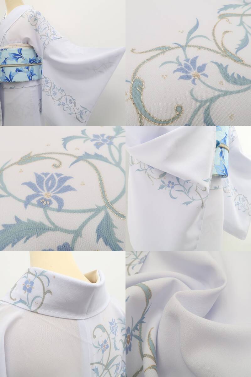 撮影時に一度着付けたのみの新品・未使用。仕付け糸付きのままお届けいたします。