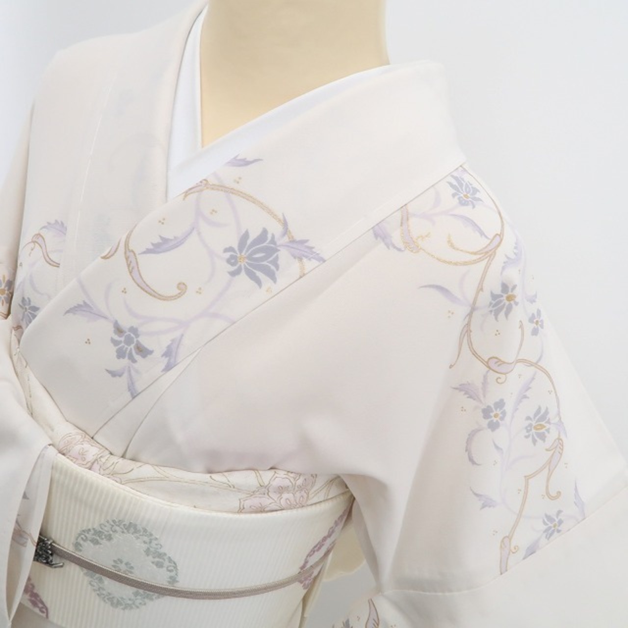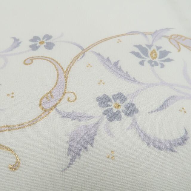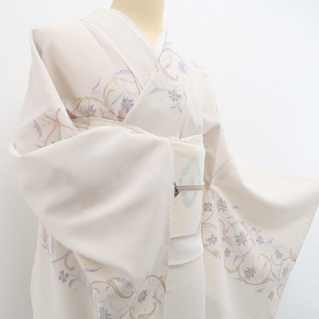 淡く澄んだ灰梅色の地に、風にそよぐような唐花の模様が涼やかに広がる…