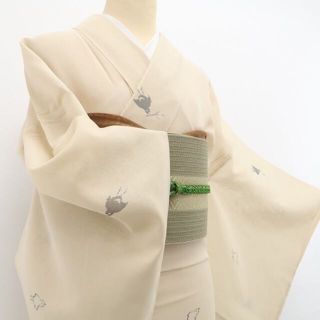 ふんわりとやさしい浅黄色の地に、千鳥がそっと遊ぶ、愛らしい夏の紬でございます。