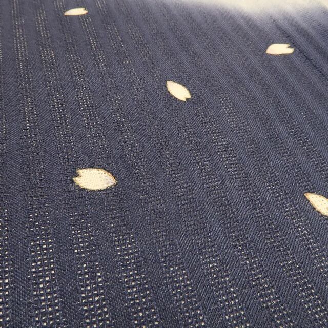 深みのある鉄紺の地に、ほのかな暈しと桜の花びらが浮かぶデザインは、潔く、そしてどこか儚げです。