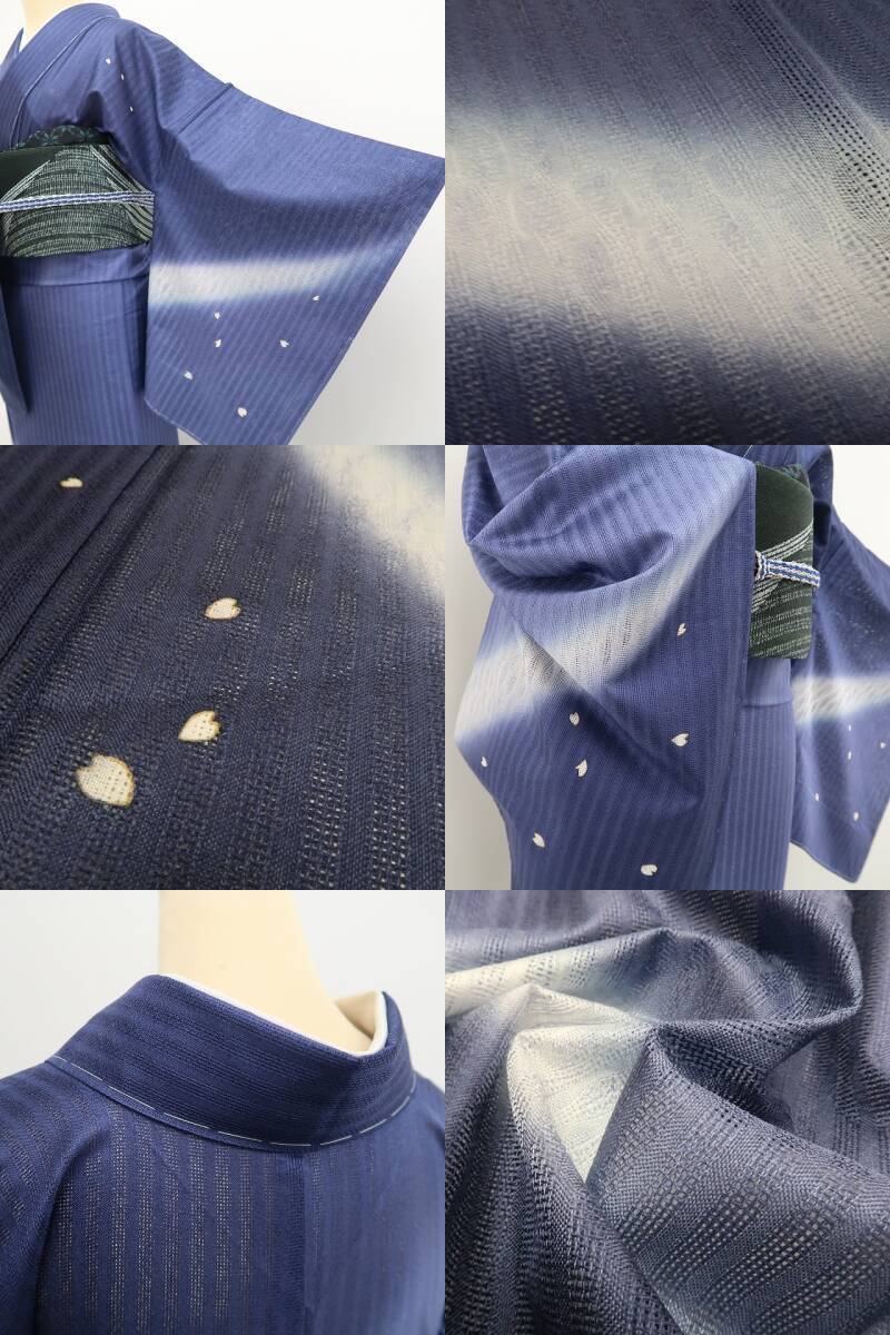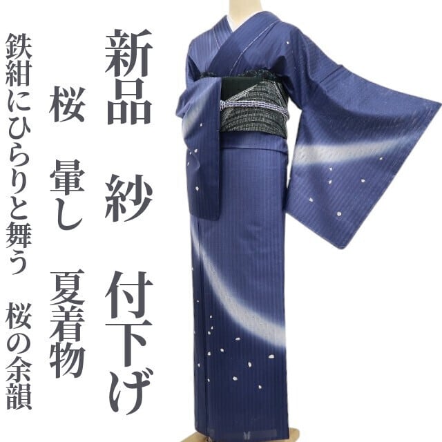 新品 紗 桜 暈し 夏着物 正絹 仕付け糸付”鉄紺にひらりと舞う、桜の余韻”付下げ 5968