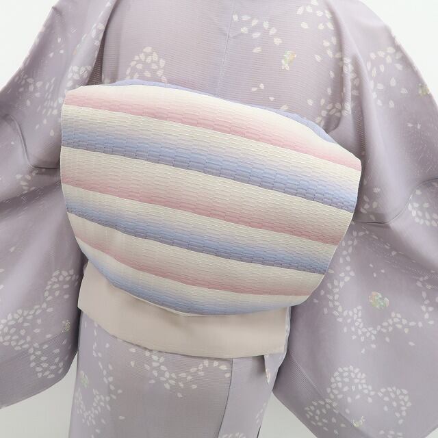 上品な浅紫色に「他とは違う」を体現する夏の虹は、夢心地を解く淡い色味に独特の立体感ある美しさで楕円型の泡を繋ぎ、見る角度で変化をつけ、裏表もない優しさと華やかさと共に夏の後ろ姿を美しく演出、きゅっと結んで鏡を覗けば、お気に入りの夏着物も恍惚の表情で夢を見ていることでしょう。