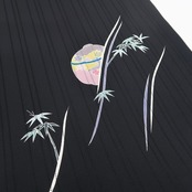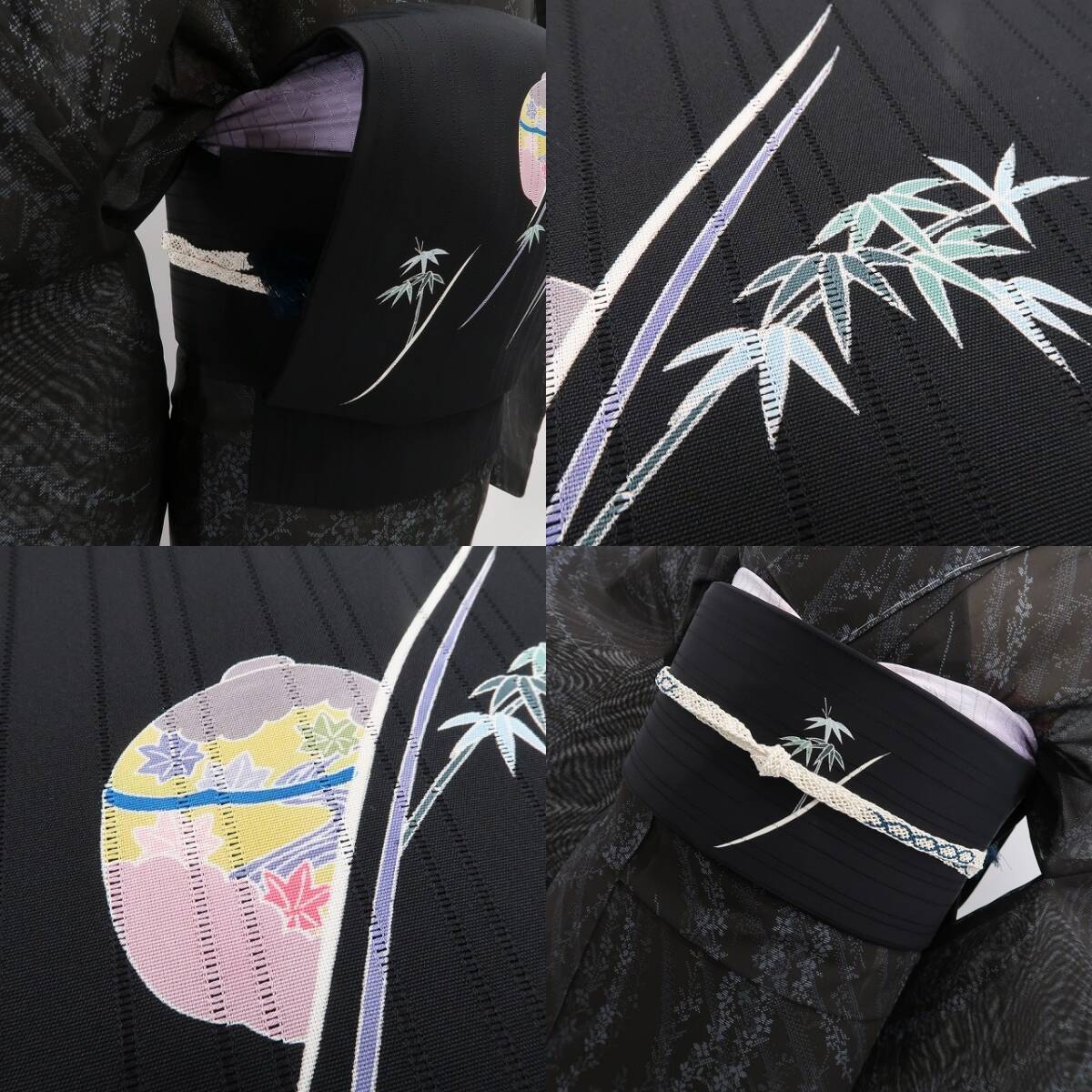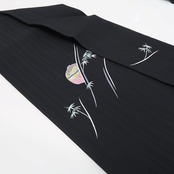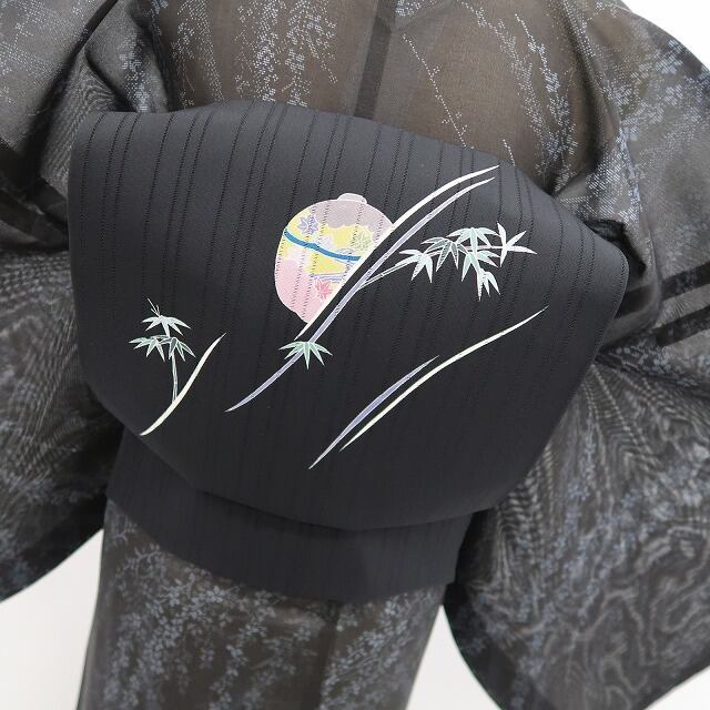 絽織で生み出す涼やかな風を感じ、しなやかに風情を奏でる竹や夏草、少し恥ずかしがって顔を覗かせるのは、早く蓋を開けたそうな流水に紅葉、雲の華やぎが黒地に映える一本は、敢えて飾り立てずにわびさびを感じ、視覚も心も引き寄せます。