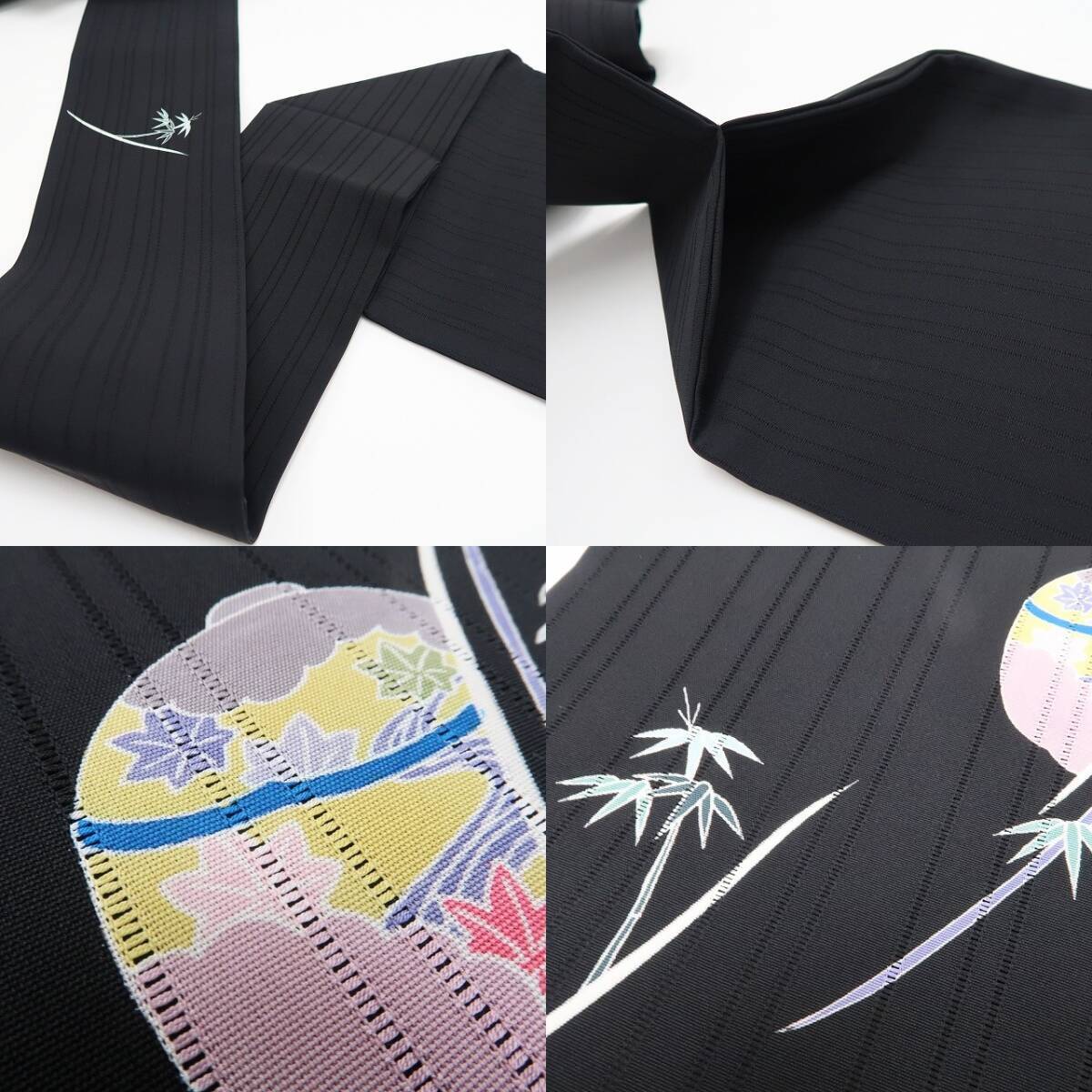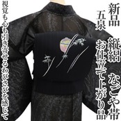 盛夏の素材として涼しげでさらりとした生地質が魅力、着用される方にもまた見る方にも清らかな風を感じるような涼しさを届ける絽織。こちらは、絽目と言われる透ける部分が縦縞のように表れる縦絽の粋な涼味を活かし、万能な黒色も手伝って夏の様々なシーンで重宝すること請負の五泉“縦絽” 正絹なごや帯でございます。