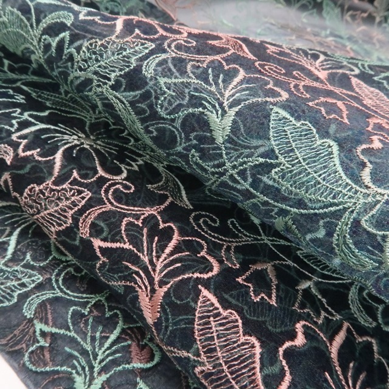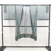 葉と花を想像させる薄萌葱色×薄紅色で繊細に浮かび上がる唐花は、まるで宙を羽ばたくかのようにシースルーにその息吹を響かせ、繊細なレースのような世界を築き上げ、そっと手に取り、ひとたび纏えば、唐花と共に宙を羽ばたく気分に包まれながら天女の羽衣を手に入れた気分が沸き起こる、オーガンジー刺繍“唐花” 正絹仕付け糸付ロング丈長羽織でございます。
