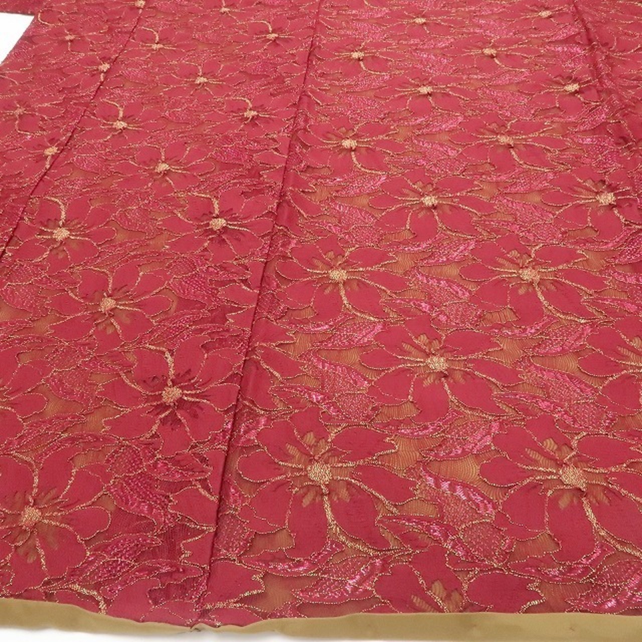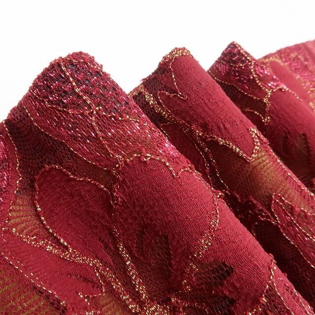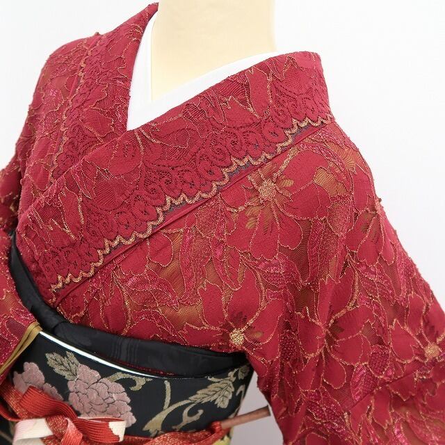 中紅色が目を惹くこちらの振袖は、繊細な総レースの質感と落ち着いた色味が調和した、大人の品格を感じさせる一枚。
