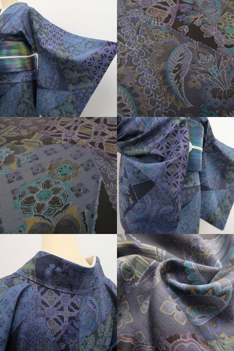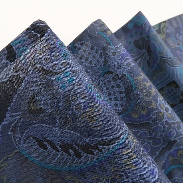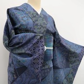 紺鼠色の色味が創り出す艶色の表情、色柄の濃淡に揺らぎを魅せる精微な更紗模様の美しさ、それは豊かな温もりに深みの幻想を描く前田仁仙の世界観、“ようこそ仁仙更紗の世界へ!”、何とも言えない独特の色合いが着物の奥行を一段と美しく際立たせています。
