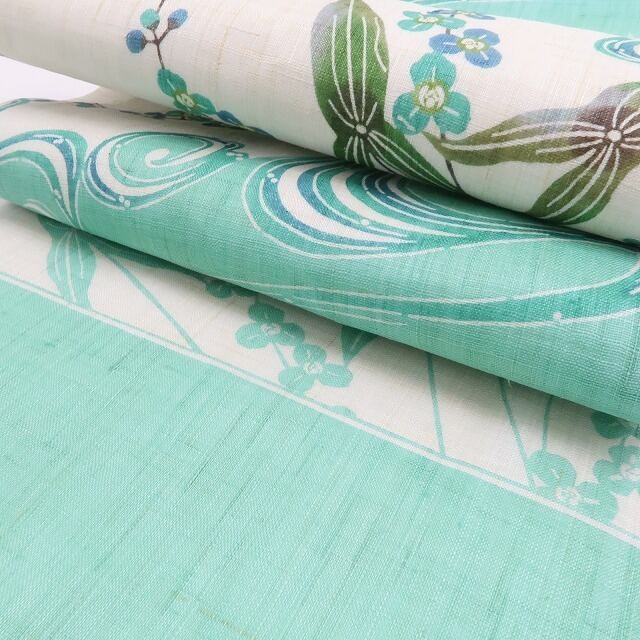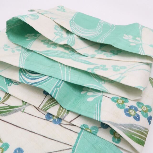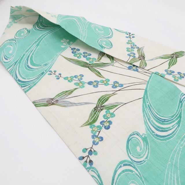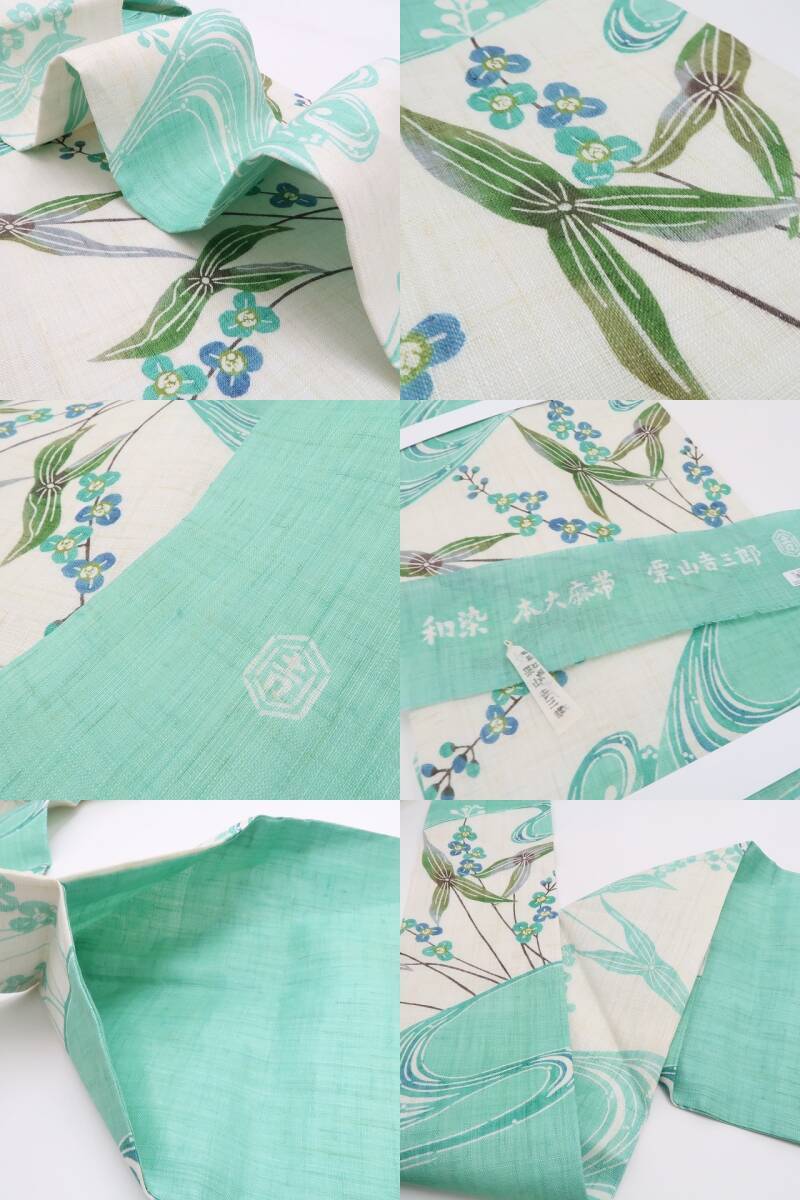 象牙色と青竹色の爽やかな色味で描き込まれた“流水に沢瀉”の創作デザイン、心趣く夏の風物が創り出す心地よい涼味、それは本麻素材のさらっとした質感に季節柄が醸し出すこの上ないお洒落感、これぞ!栗山帯の神髄!見事です。