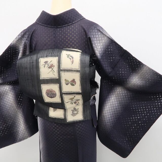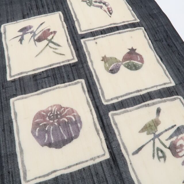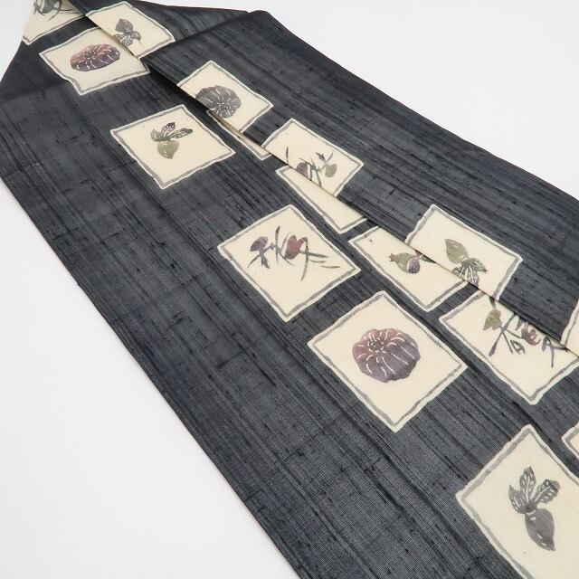 涼やかな黒の帯地にモダンなタッチで織り込まれたカボチャやナスの野菜柄、紗の透明感に“春夏秋冬”の文字柄が添えるこの上ないお洒落感は格別!“季節の風に想いを綴り心癒して絹芭蕉”、お気に入りの着物に合わせて素敵な和装をどうぞお楽しみください。