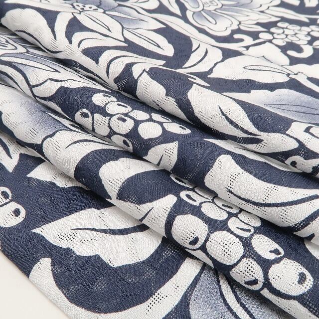 清々しさを引き立てる藍鉄色の彩色、全面に描き込まれた精微な花葉のデザインモチーフ、それは紗の透明感に濃淡状で浮かび上がる“葡萄更紗”の美しさ、古典的な題材ながらもさりげなくお洒落を演出する小粋なセンス…貴女にエレガントな魅力と深みを備えた大人の着姿を。