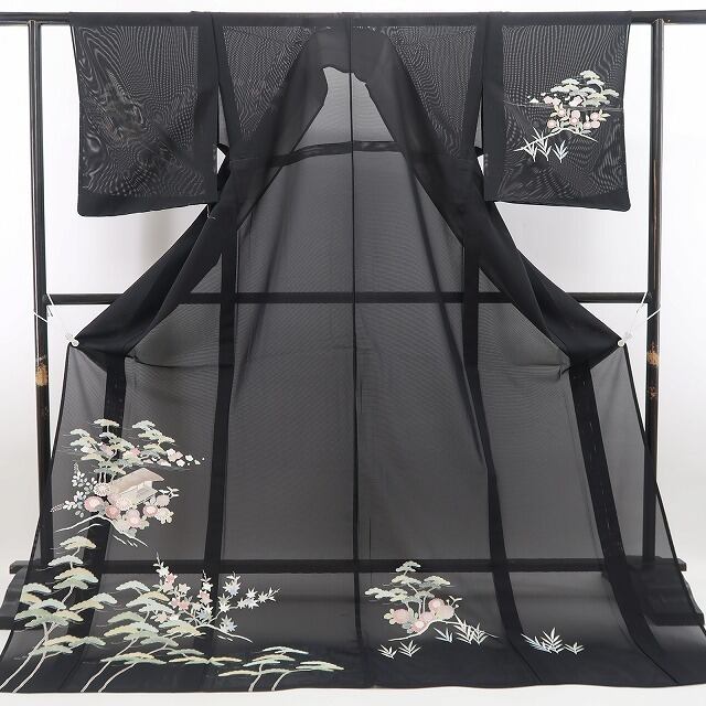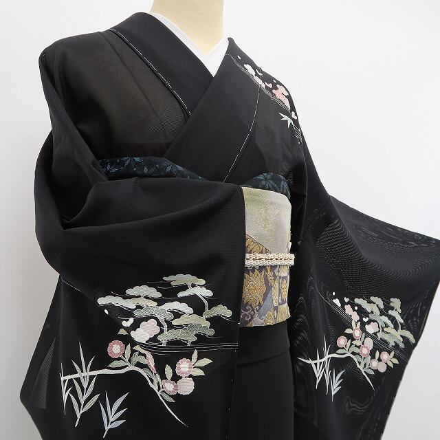 黒の絽地に松や草花など自然の風景が繊細に描かれた、手描き友禅の訪問着でございます。