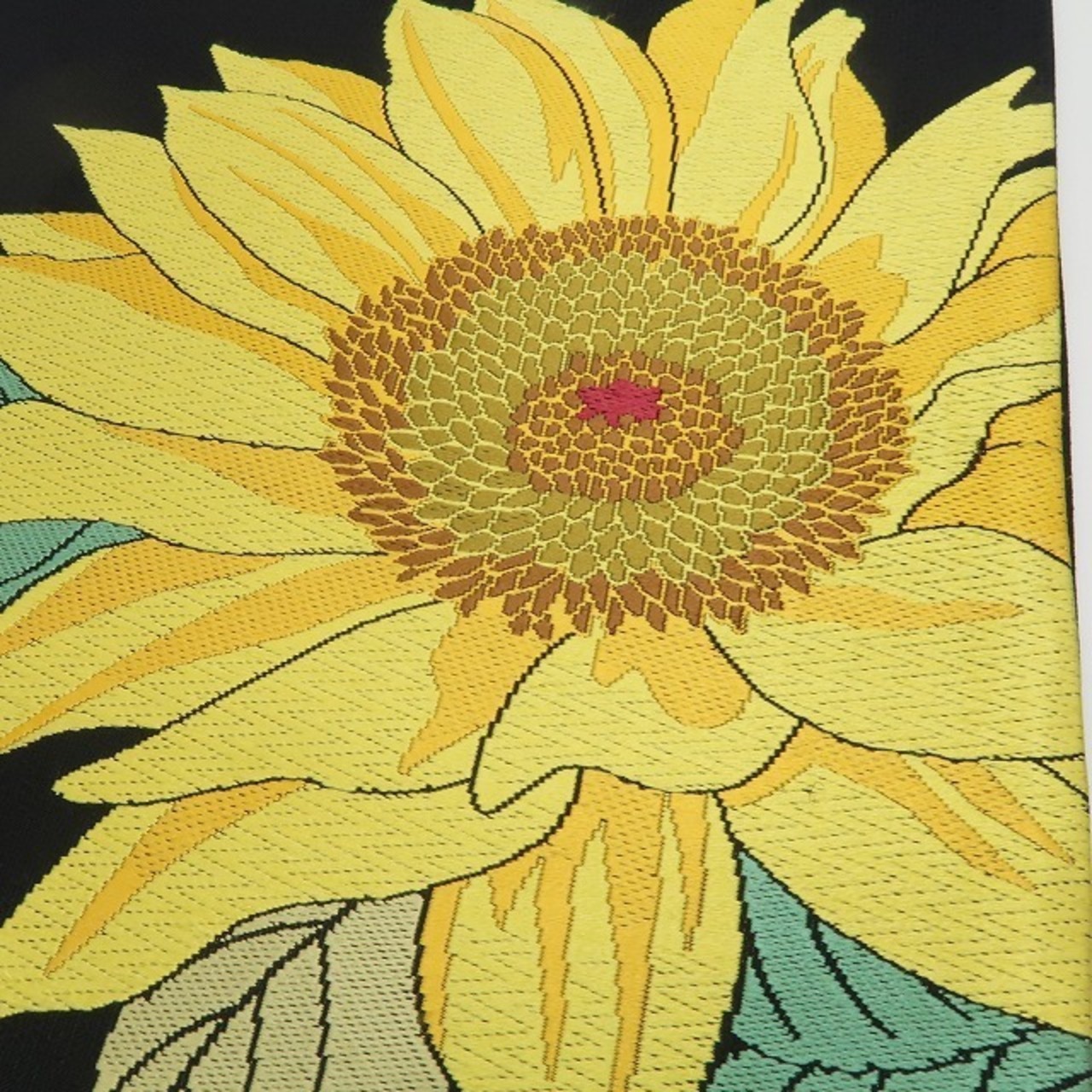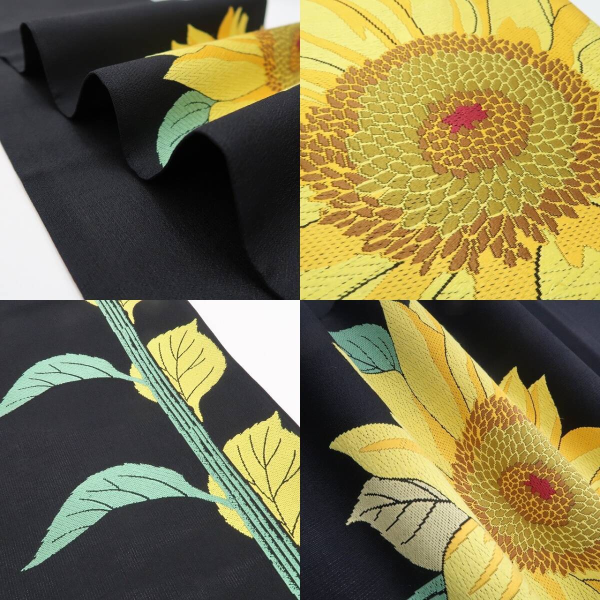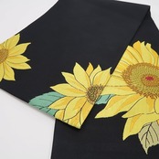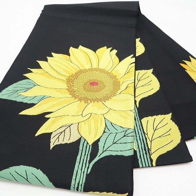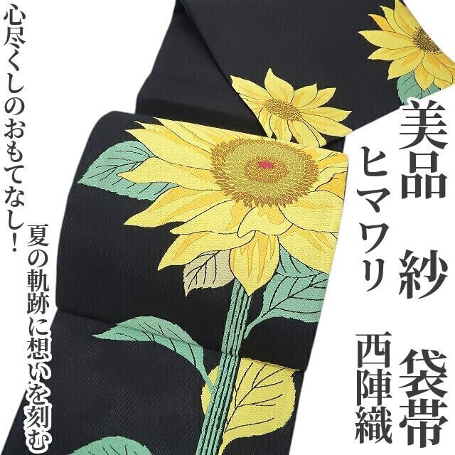 丸みある黒の色地に織り出された季節の風物“ヒマワリの花”、彩りのコントラストに浮かび上がるキラキラとした夏の煌き、それは紗の透明感に醸し出される西陣帯の高級感そのもの、ダイレクトに夏帯の魅力を映し出すひと品、素敵です。