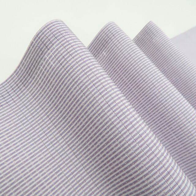 柔らかな竜胆色の地に広がる大人びた艶、彩り全面に引かれたきめ細かな万筋の縞模様、それは伝統に培われた型染めの情熱そのもの、正に“堅牢に心を染め出す美しき技”…美を追求する江戸小紋の揺るぎない歴史が秘められています。