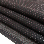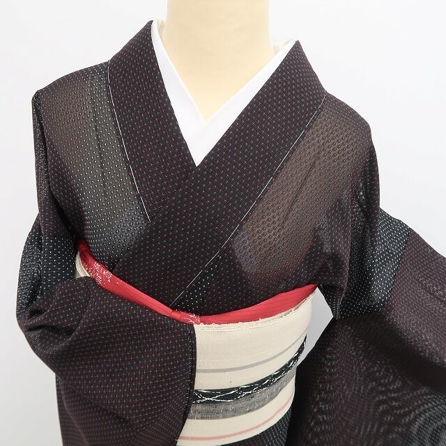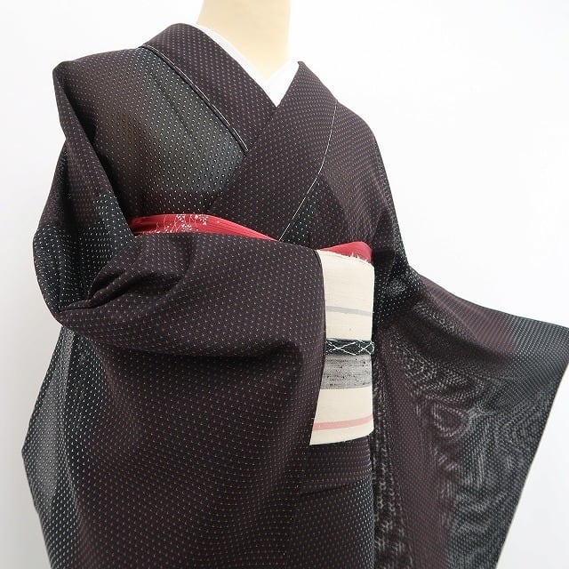 落ち着いた黒の地に広がるこの上ない大人びた表情、紗の透明感に赤の挿し色で整然と浮かび上がる繋ぎ小柄のモダンデザイン、それは巧みな意匠が醸し出す洗練の風そのもの…手くくり手摺り込みによる絣糸を一本一本合わせながら織り上げるお召の味わい、独特のしっとりとした風合いが着物の味わいを一段と馴染みやすい趣に変えています。