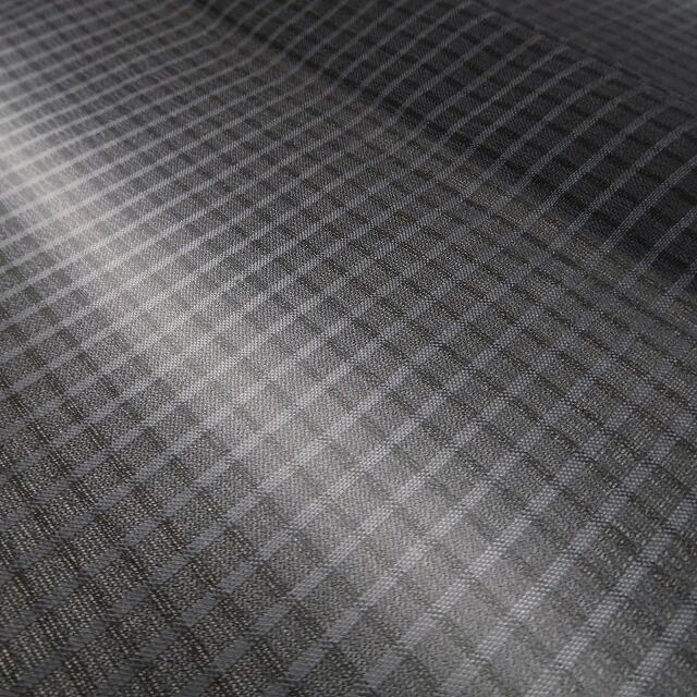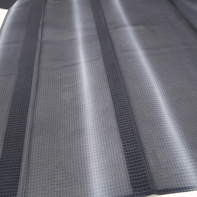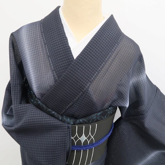 大島独特のシャリ感が活きる涼やかな青褐色の色使い、紗の豊かな透明感に涼を趣く格子状のデザインライン、それは縦状の構図に暈しの技が創り出すお洒落紬の心地よい風!溢れ出す清々しさに薫り立つ夏紬の見事な風合い、どれを取ってもその上質さは本場大島紬ならでは、素敵です。