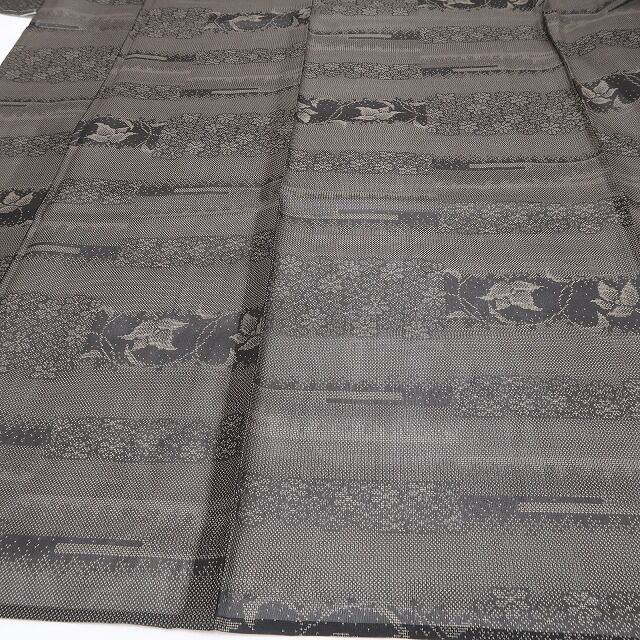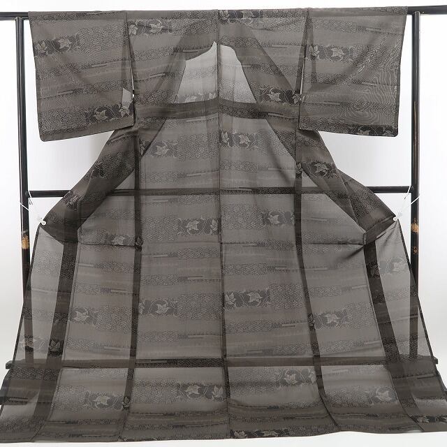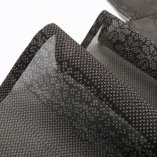 趣ある涅(くり)色の彩色が放つ涼やかな表情、濃淡の構図で横段状に連なる花繋ぎのデザインモチーフ、それは紗の透明感に独特のシャリ感が醸し出す和を心得たモダンな色艶、糸一筋一筋丁寧に織り上げられた上質さはやはり本場大島紬ならでは…清々しい紬のシルエットがエレガントな魅力と深みを備えた大人の着姿を叶えてくれます。
