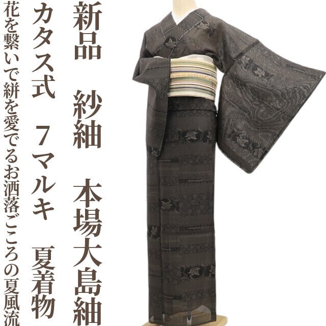 新品 紗紬 カタス式 7マルキ 夏着物“花を繋いで絣を愛でるお洒落ごころの夏風流”正絹 仕付け糸付 本場大島紬 6093