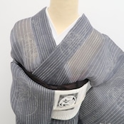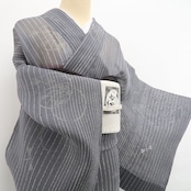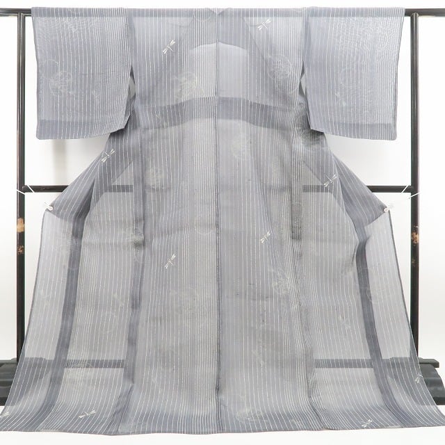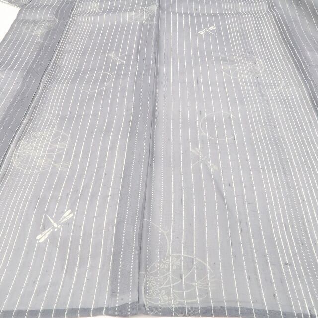 グレー地にすっきりとした縦縞が走り、蜻蛉(トンボ)が飛び交う涼やかな一枚。