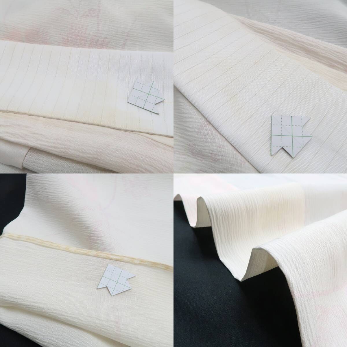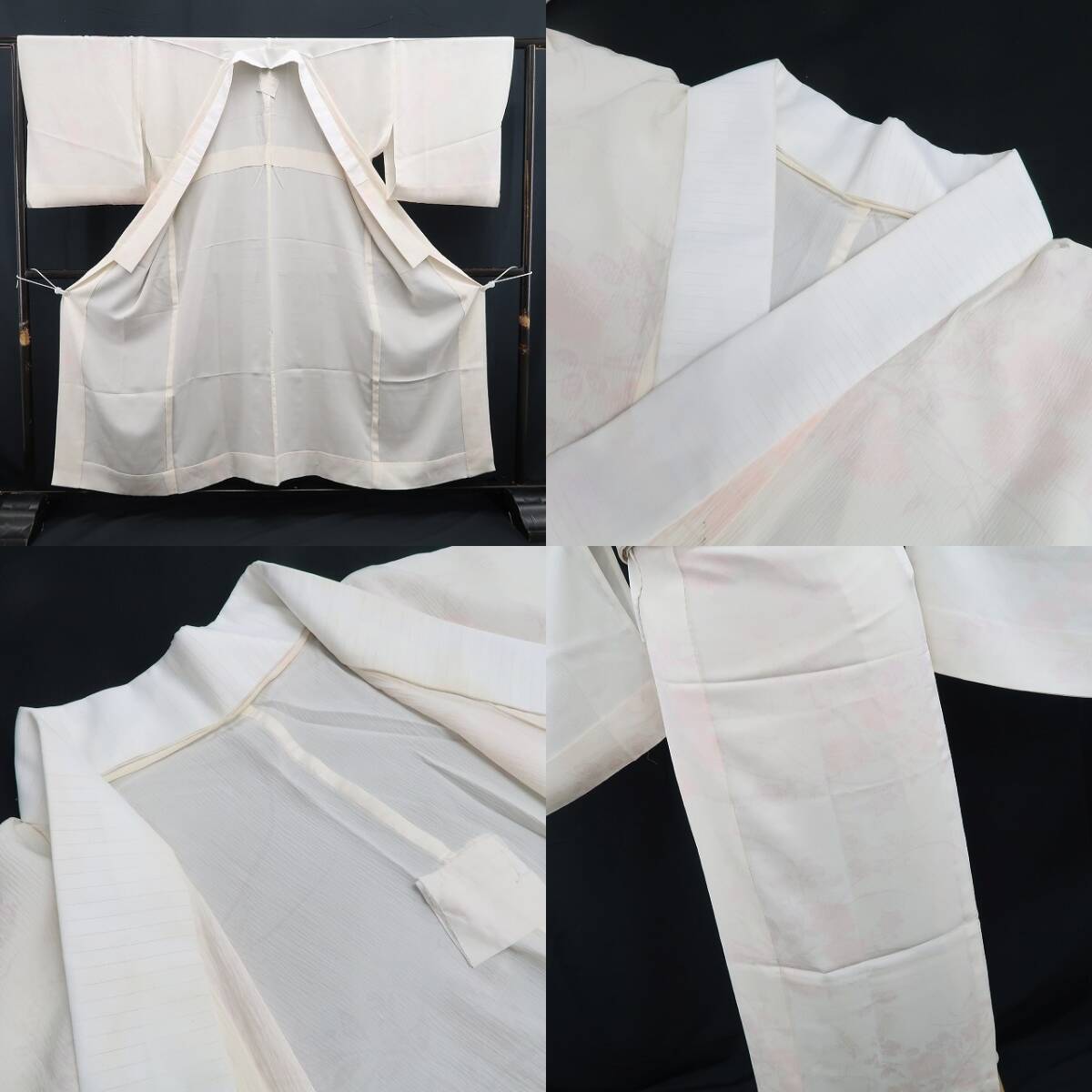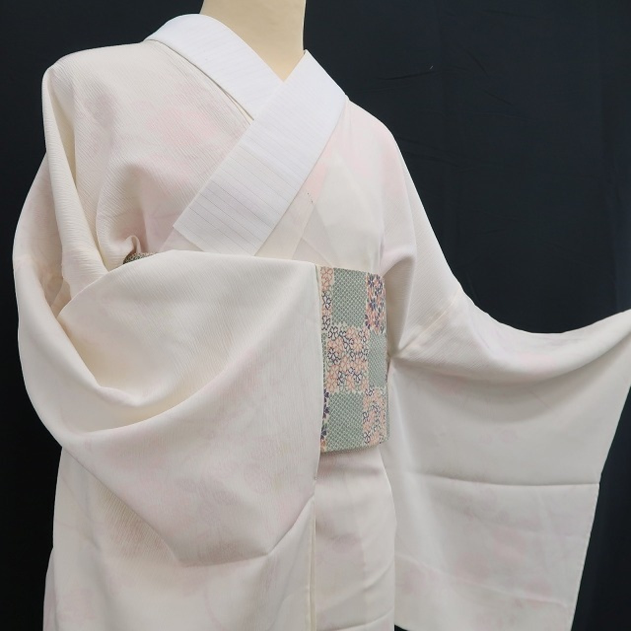 灰桜色の優彩にほんのりと浮かび上がる花葉の陰影、色柄の濃淡が醸し出す丸み帯びた優の温もり、隠れたところにも気を配る大人のお洒落 それは正に“秘すれば花なり”…女性らしさと心地よい肌触りにもきっとご満足いただけることでしょう。嬉しい手縫い仕立ての一枚…両袖口に汚れがあるのみの状態が良いお品でございます。