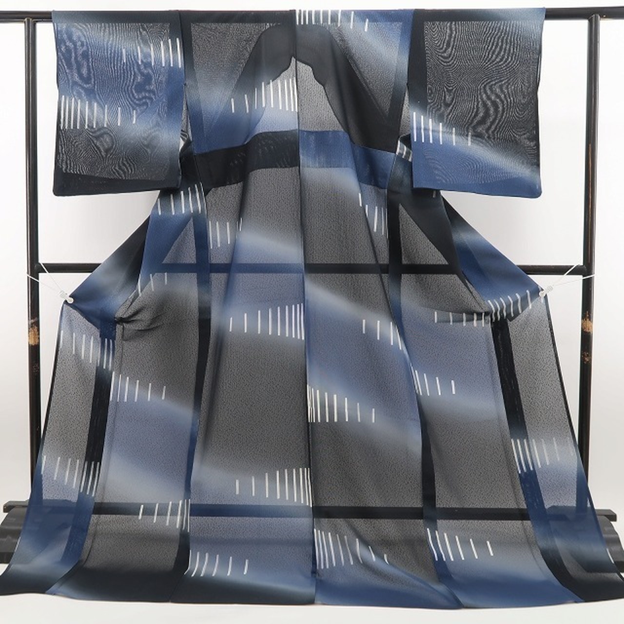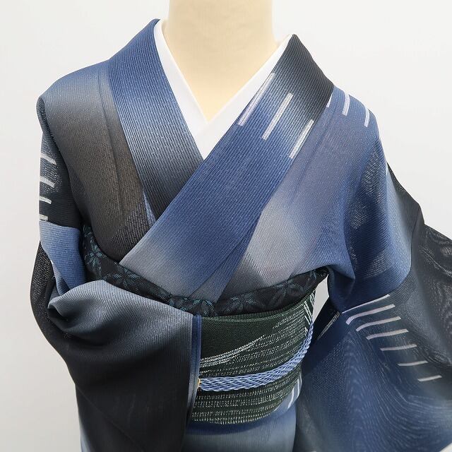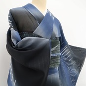 黒と青藍色の濃淡が醸し出す大人色の表情、巧みな構図で浮かび上がるアシンメトリーなデザインライン、それは紗の透明感に洗練の意匠が創り出すこの上ない夏の涼味、ダイレクトに創作小紋の愉しみ方を届けてくれるひと品、涼やかさとともに貴女の装いの満足度を上げてくれること間違いなし!